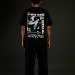 This oversized dropshoulder tee features a bold, abstract graphic with a reminder we all feel—everything is temporary. Made from soft, heavyweight cotton and detailed with striking monochrome art, it’s designed to stand out while keeping you comfortable. Perfect for everyday wear with a deeper edge.
